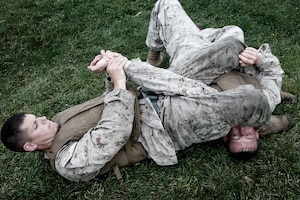 In chess, a move is often designed to set up a bigger play down the line, and Grissom Marines are learning similar moves, not for a board game, but for hand-to-hand combat. Three Marines from Detachment 1, Communication Company, Combat Logistics Regiment 45, 4th Marine Logistics Group, underwent