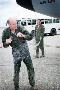 Col. Chris Amend, 434th Operations Group commander, completed his final flight at Grissom Aug. 7, and was met with smiles, laughter, hugs -- and lots of water.After touching down and climbing down the crew ladder of a KC-135R Stratotanker, Amend was hosed down with water, which is tradition of Air