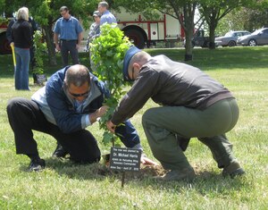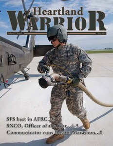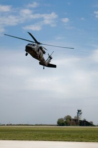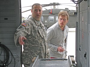Sergeant Scott Darrall, a flight medic and platoon sergeant with the Indiana Army National Guard, shows reporter Carson Gerber the interior of a UH-60 Black Hawk helicopter. Elements of the 2-238th Medevac unit are at Grissom for pre-mobilization training and took time out of their schedule to