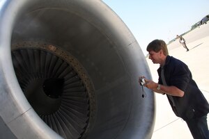 Aaron Kosberg, along with other civic leaders, takes photos of a KC-135R Stratotanker prior to a civic leader orientation flight. The visit to Grissom and subsequent flight gave the civic leaders a first-hand look at the mission of the 434th Air Refueling Wing and the world-wide impact of Grissom
