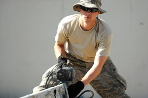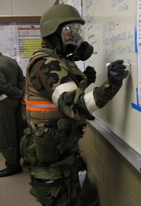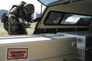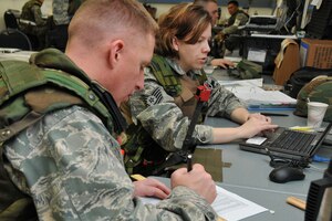 1st Lt. Chris Tusing and Tech. Sgt. Erin Baker work cargo movement plans during an operational readiness inspection at Volk Field, Wisc. Reservists from Grissom and Guardsmen from Martinsburg, W.Va., teamed together for an operational readiness inspection. (U.S. Air Force photo/Master Sergeant Emily