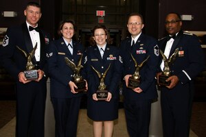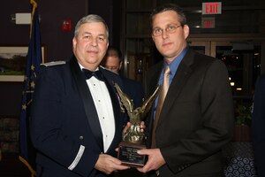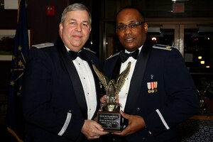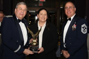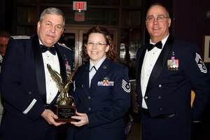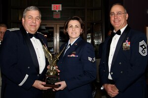Tech. Sgt. Erin Baker, 434th Logistics Readiness Squadron logistics plans technician, receives a trophy in recognition for being named 434th Air Refueling Wing Noncommissioned Officer of the Year from Brig. Gen. Dean Despinoy, 434th ARW commander, and Chief Master Sgt. Larry Brady, 434th ARW command