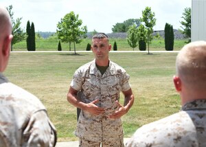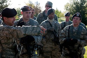 Tech. Sgt. James Marshall, 434th Security Forces Squadron tire team leader, gives a safety briefing to his teammates before a Shoot, Move, Communicate exercise May 15, 2016 at Grissom Air Reserve Base, Ind. The exercise is designed to allow SFS members to practice communicating during a simulated